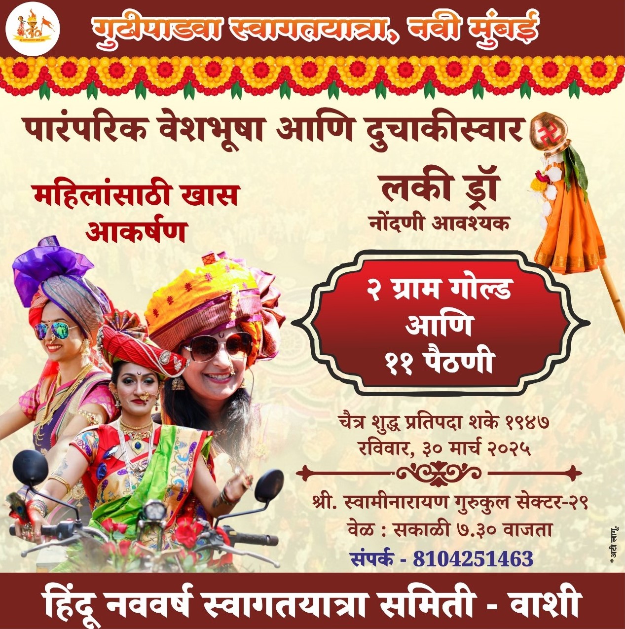 🌸 गुढी पाडवा विशेष महिला लकी ड्रॉ स्पर्धा! 🌸 आपल्या परिसरातील सर्व महिलांसाठी भव्य लकी ड्रॉ स्पर्धा आयोजित करण्यात आली आहे. या विशेष स्पर्धेत भाग घ्या आणि जिंका २ ग्रॅम सोन्याचा नाणे आणि ११ पैठणी साड्या! ✨